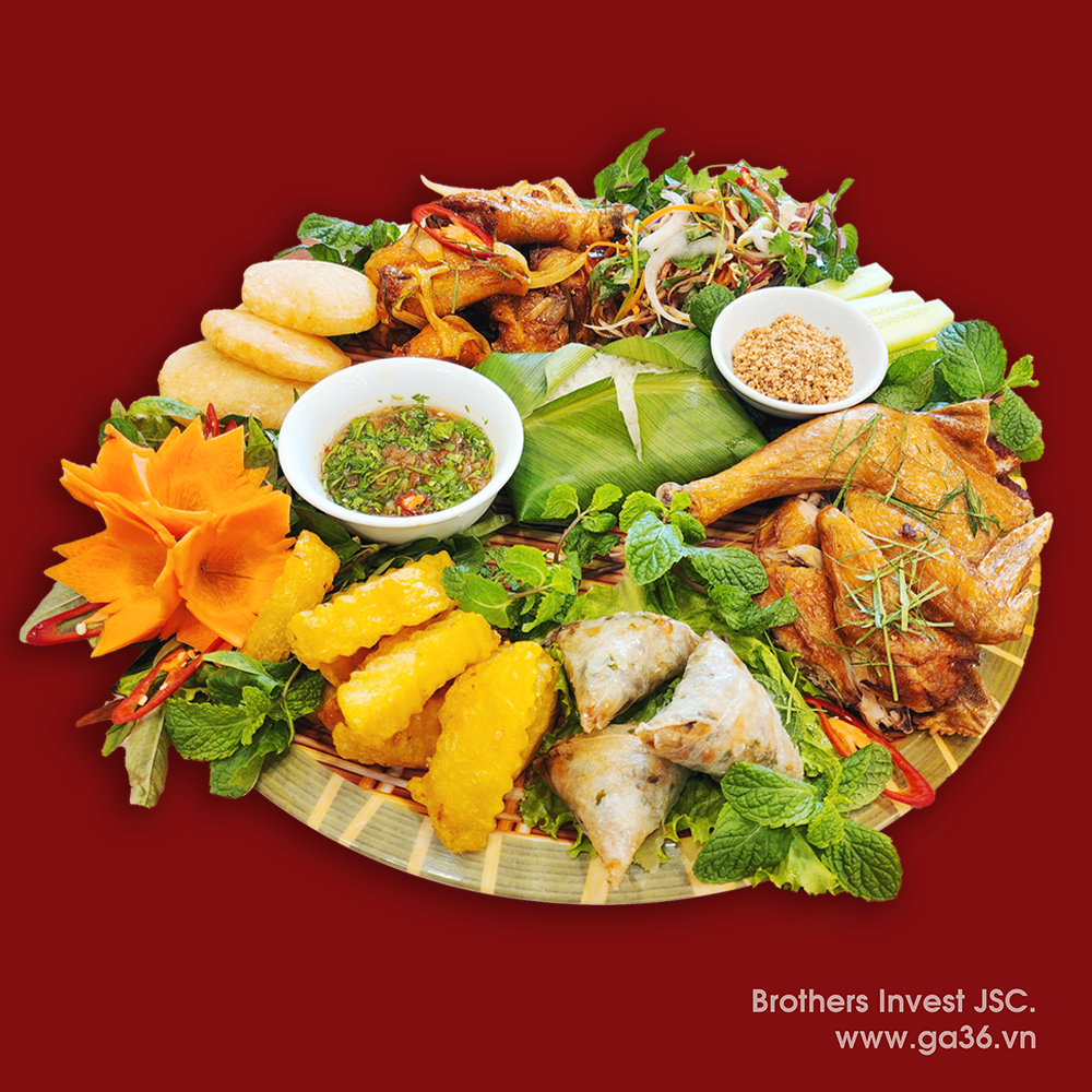 – Gà quay: 1/2 Con – Gà chiên mắm: 1/2 Con – Nem gà: 03 Chiếc – Xôi trắng: 1/2 Đĩa – Nộm hoa chuối: 01 Đĩa – Bánh xôi: 03 Chiếc – Dưa chuột chẻ: 01 Đĩa – Khoai tây chiên: 1/2 Đĩa